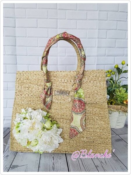 その上、お花にスワロやストーンを添え、持ち手にはエルメス風スカーフもついてます。カジュアルにもフォーマルにも使えちゃう