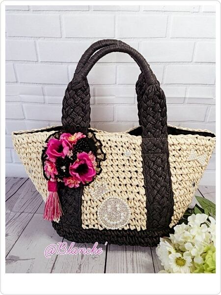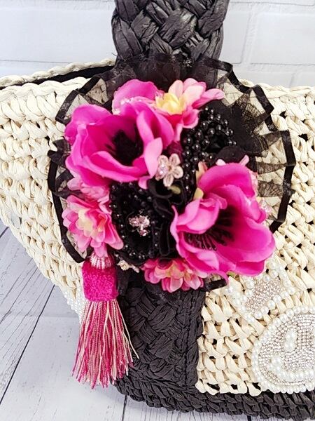 アーティフィシャルフラワーやスワロフスキー、パールやストーン、フリフリリボンで女子力満載のカゴバッグ
